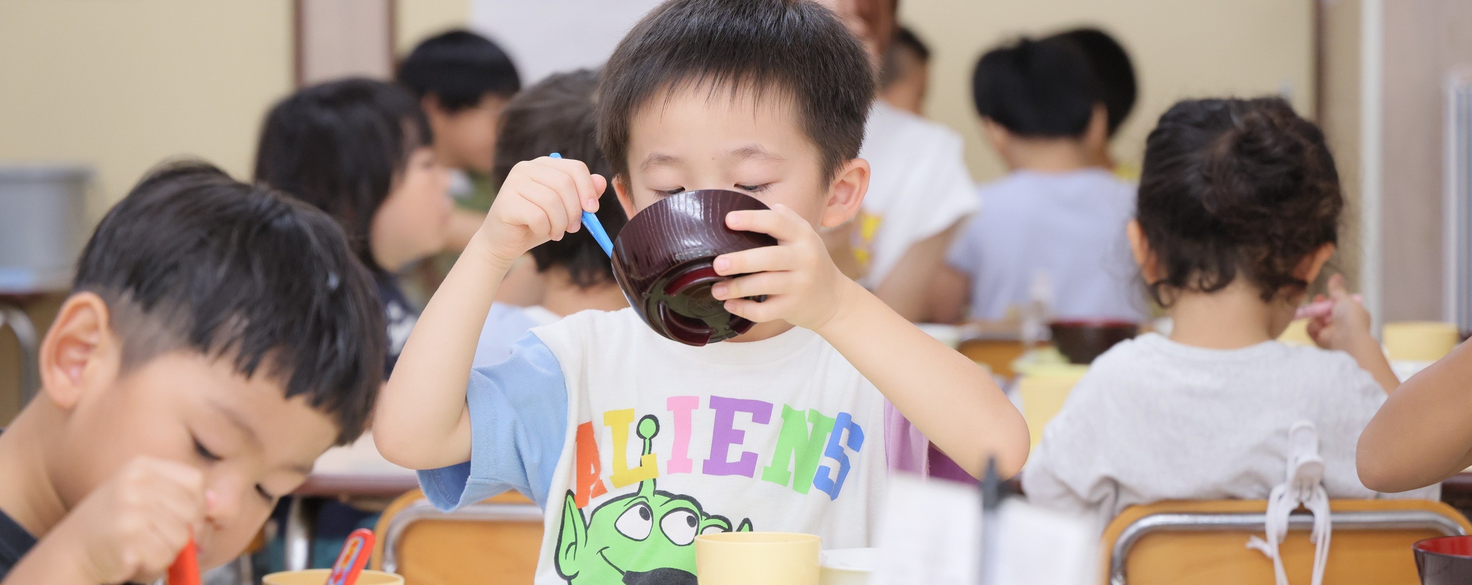 高見保育園での給食は、一斉に「いただきます」をしていません。個々のリズムに合わせて、ごはんができた時間に合わせて食べたい子から給食を食べに来ます。遊びに集中したい子はいっぱい遊んでから!