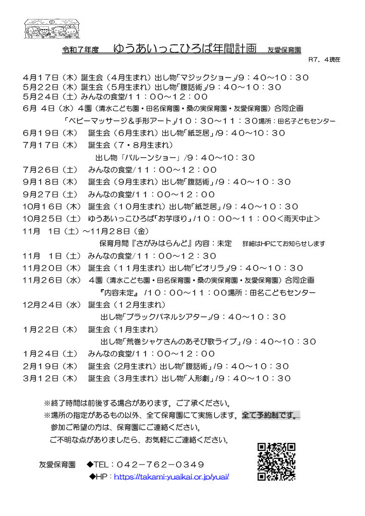 ※イベントについてのお問合せ(天候による延期や中止が知りたいなど)は、お気軽にお電話ください(042-762-0349)。